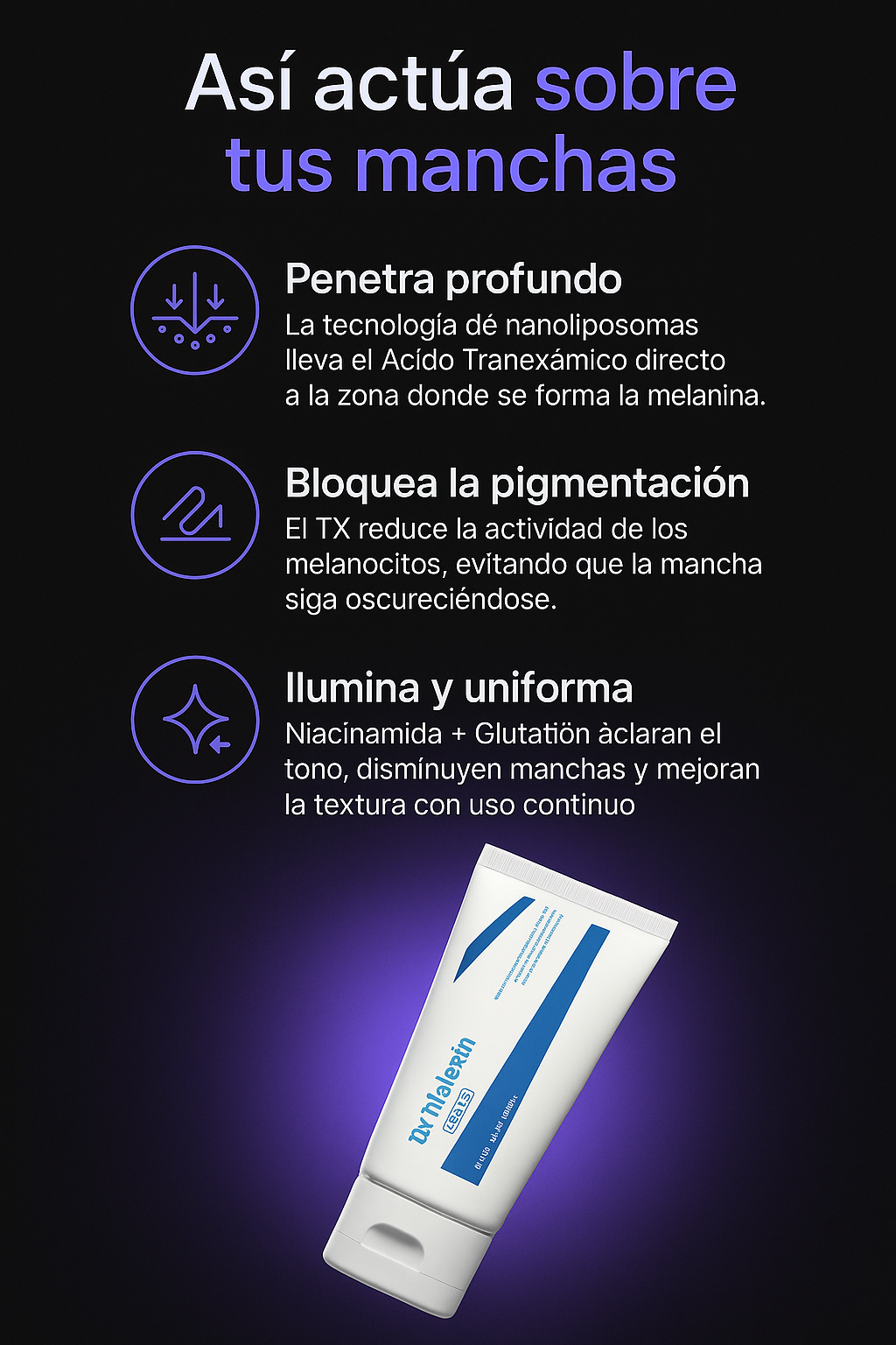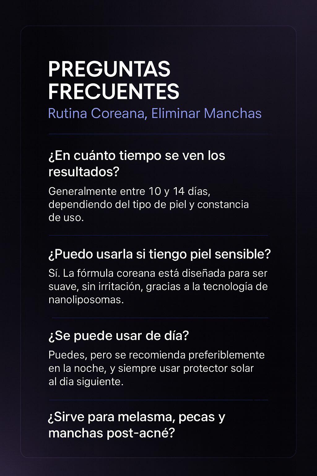 - 🌙 Reduce manchas oscuras, pecas e hiperpigmentación.